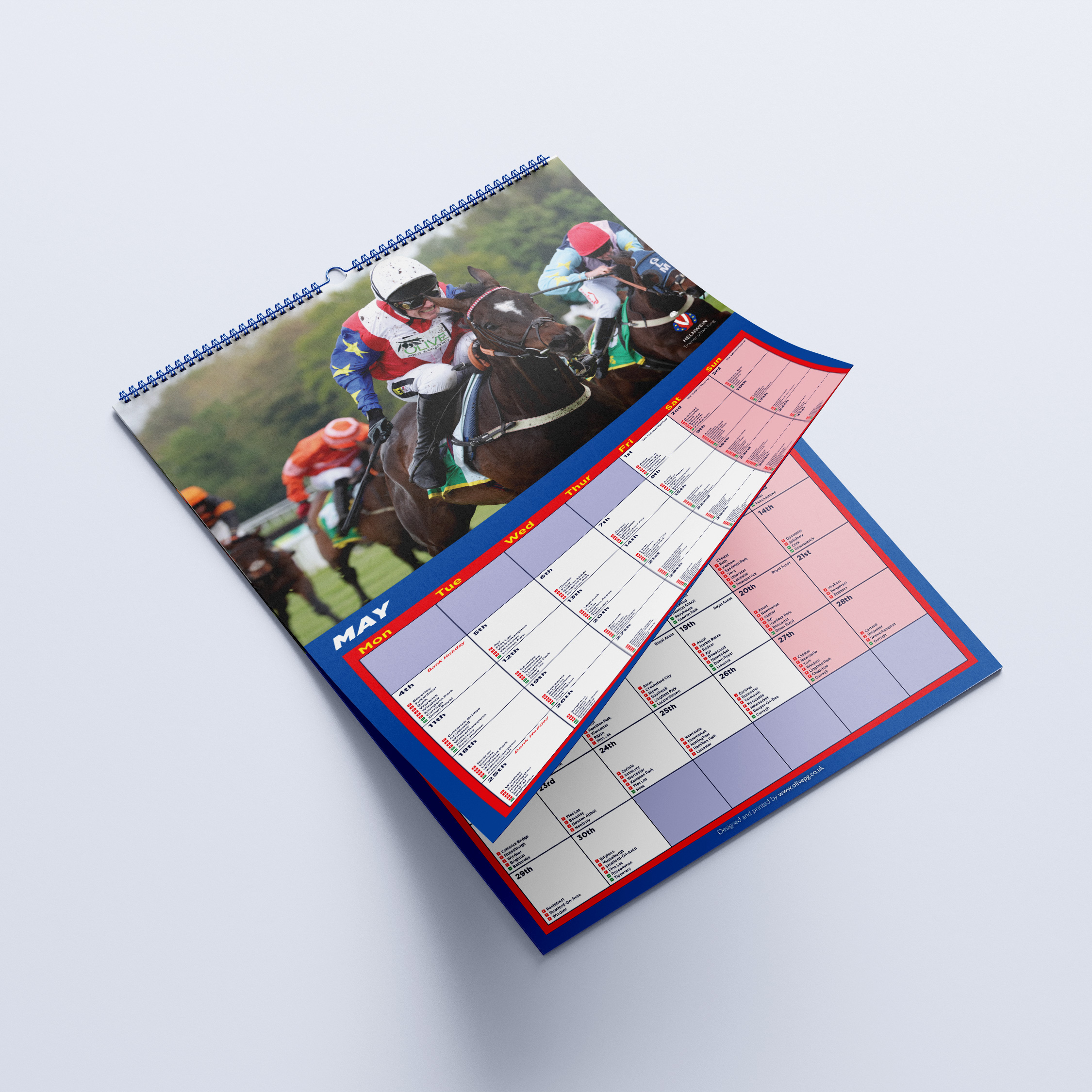 The calendar features one month to view and includes the most up-to-date race meeting information in the UK the time of publication, and highlights the key races each month.